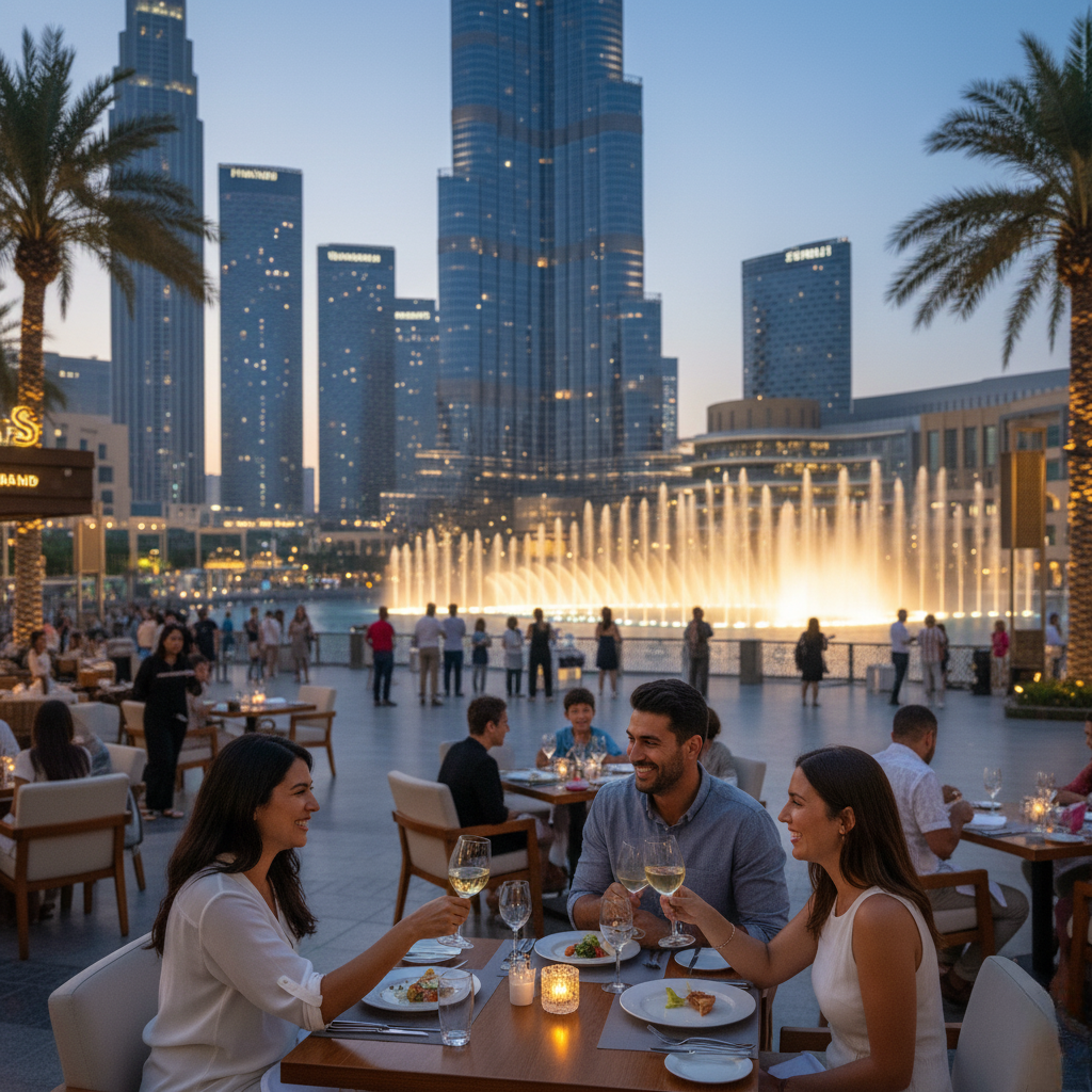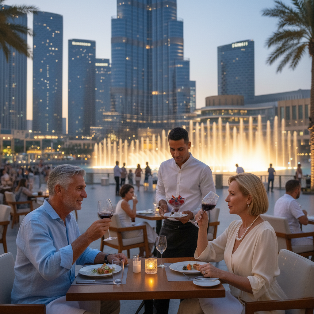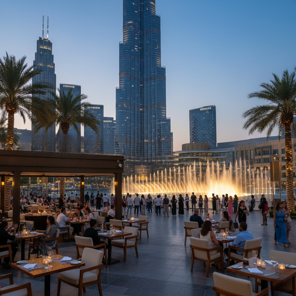 Fountain-View Terrace: The restaurant’s outdoor terrace offers front-row views of the Burj Khalifa fountain shows — a key attraction for both tourists and residents.